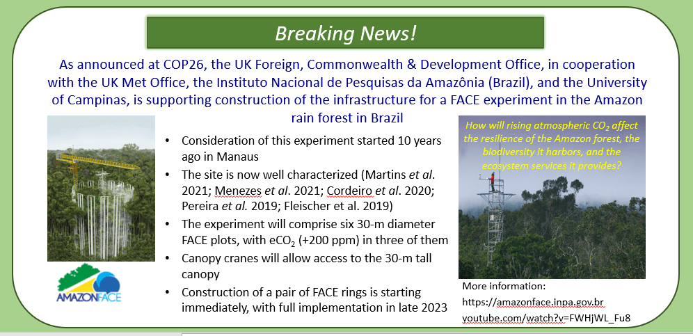 Damasceno AR; Garcia S, Aleixo IF, Menezes JCG, Pereira IS, De Kauwe MG, Ferrer VR, Fleischer K, Grams TEE, Guedes AV, Hartley IP, Kruijt B. Lugli LF, Martins NP, Norby RJ, Pires-Santos JS, Portela BTT, Rammig A, de Oliveira LR, Santana FD, Santos YR, de Souza CCS, Ushida G, Lapola DM, Quesada CAN, Domingues TF. 2024. In situ short-term responses of Amazonian understory plants to elevated CO2. Plant, Cell & Environment DOI: 10.1111/pce.14842. PDF