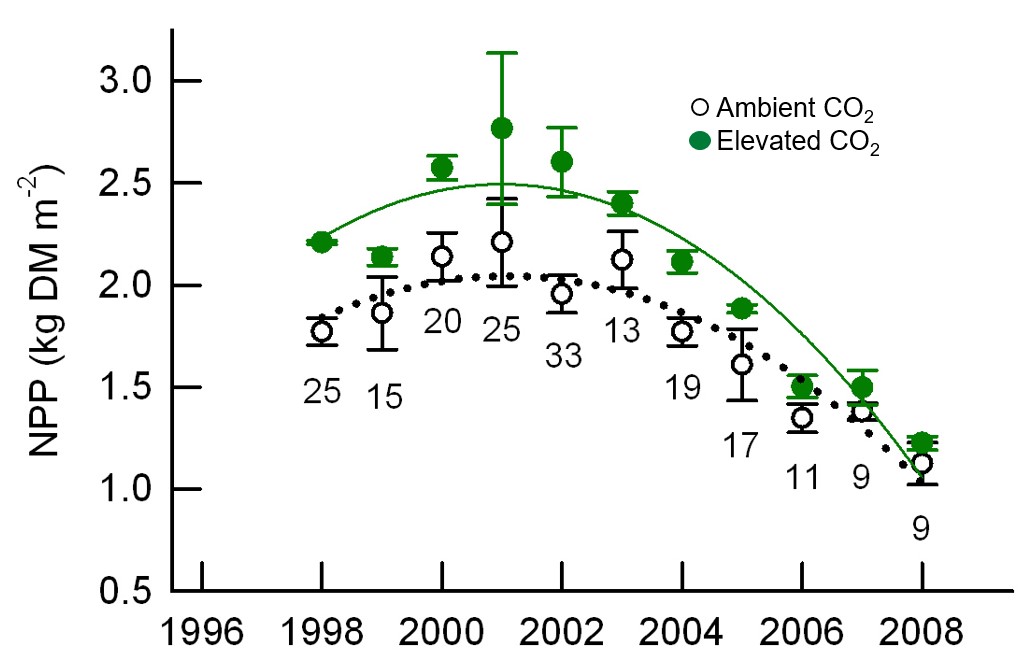 - Stable isotope analysis indicated that N availability declined faster in plots exposed to elevated CO2